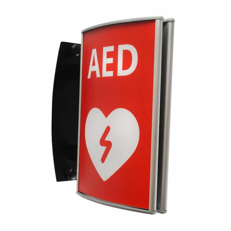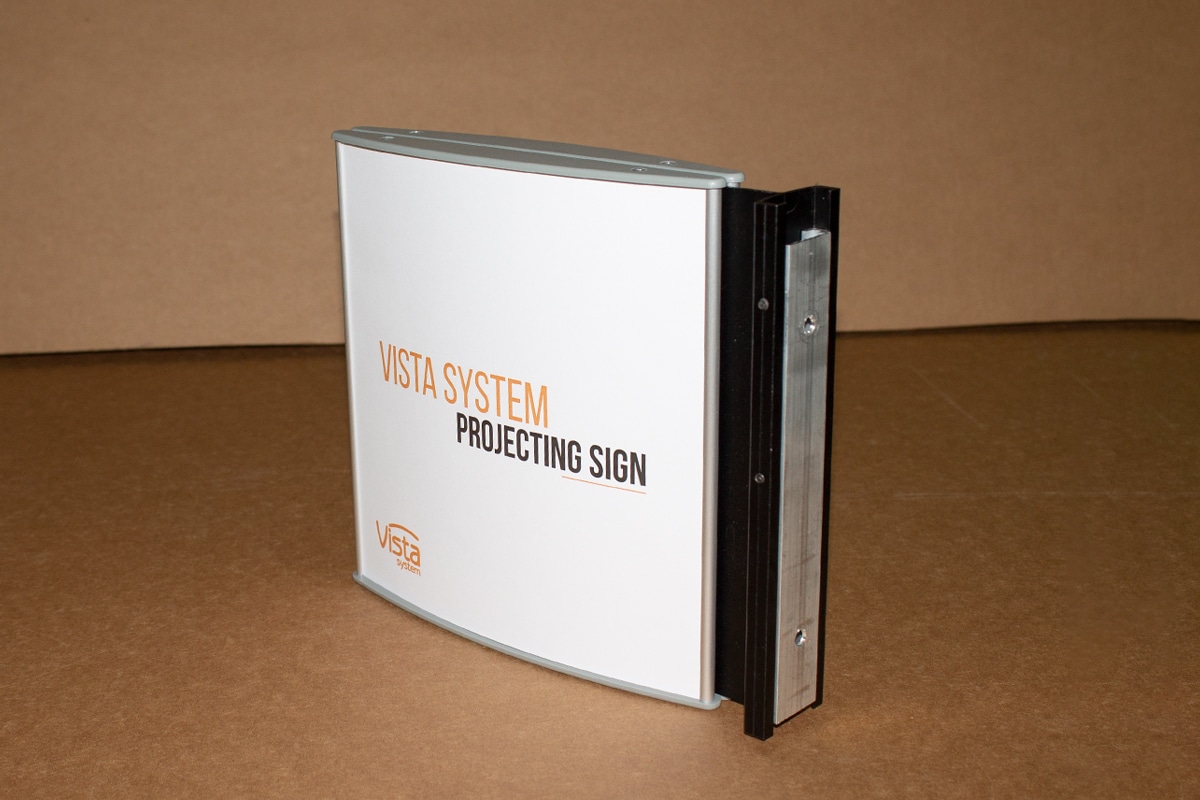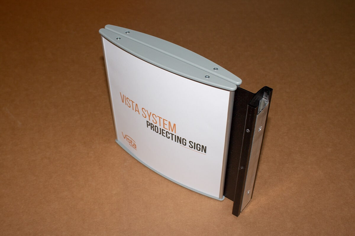 The Curved Double-Sided Vista Projecting Sign is a versatile signage solution, equipped with a sleek silver aluminium frame, an aluminium projecting arm, and plastic grey end caps in grey. The clear cover lenses are available in glossy (non-glare) finish.