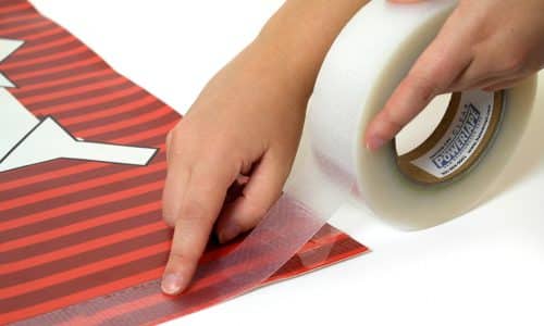 Introducing Clear PowerTape – a super strong transparent single-sided banner hem tape that eliminates the need to fold hem in the media for reinforced banner edges. With BannerUp Tabs, PowerTabs or BravoTabs on corners, simply apply the tape along the top and bottom edges of the back of the banner, punch holes through tape, tabs, and media with Banner Ups, and you’re done!