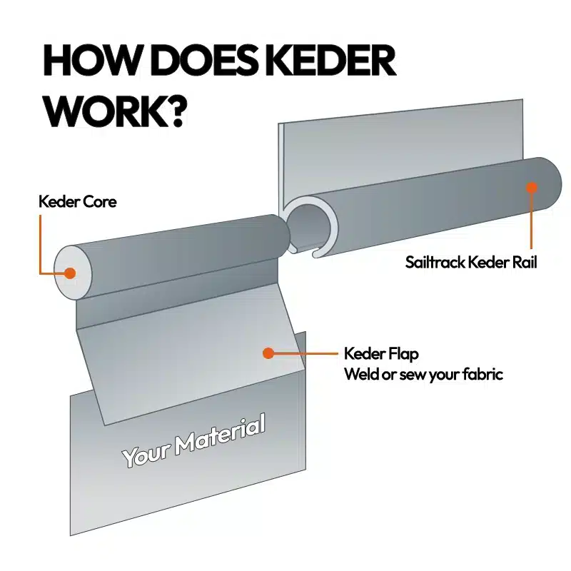 The White Keder Rope features a 6mm extruded PVC core enclosed in a strong polyester fabric sleeve, providing flexibility and easy installation. The high-quality virgin resin PVC core ensures excellent shape retention, while the textile wrap allows for smooth sliding into sailtrack extrusions.