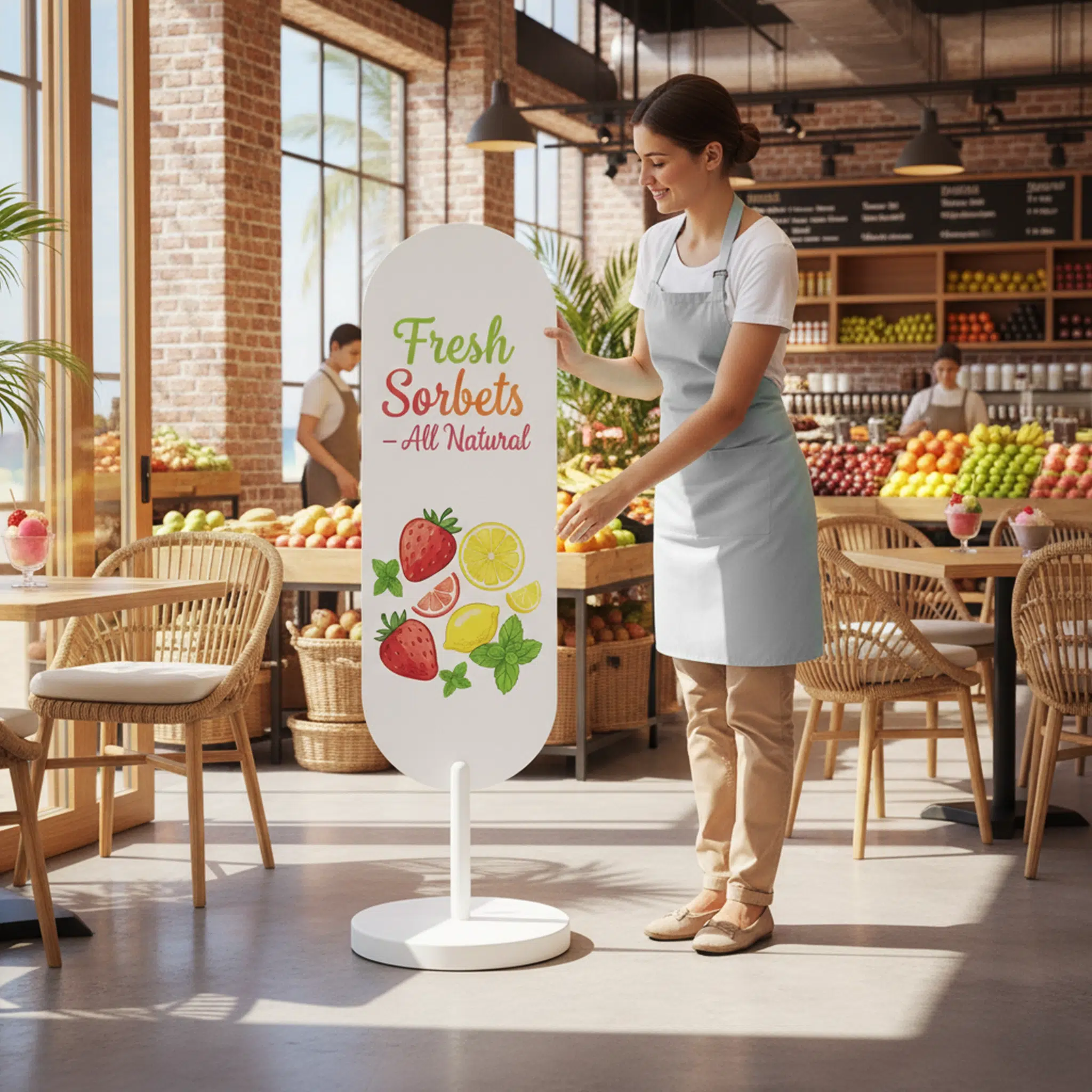 Crafted from powder-coated steel, Mira Oval is built for daily commercial use. The closed, seam-welded face and post resist corrosion, the weighted base keeps the sign planted, and the minimalist silhouette elevates any fit-out. Delivered blank and ready for vinyl, print or cut lettering, it’s the tidy, premium alternative to flimsy pavement signs.