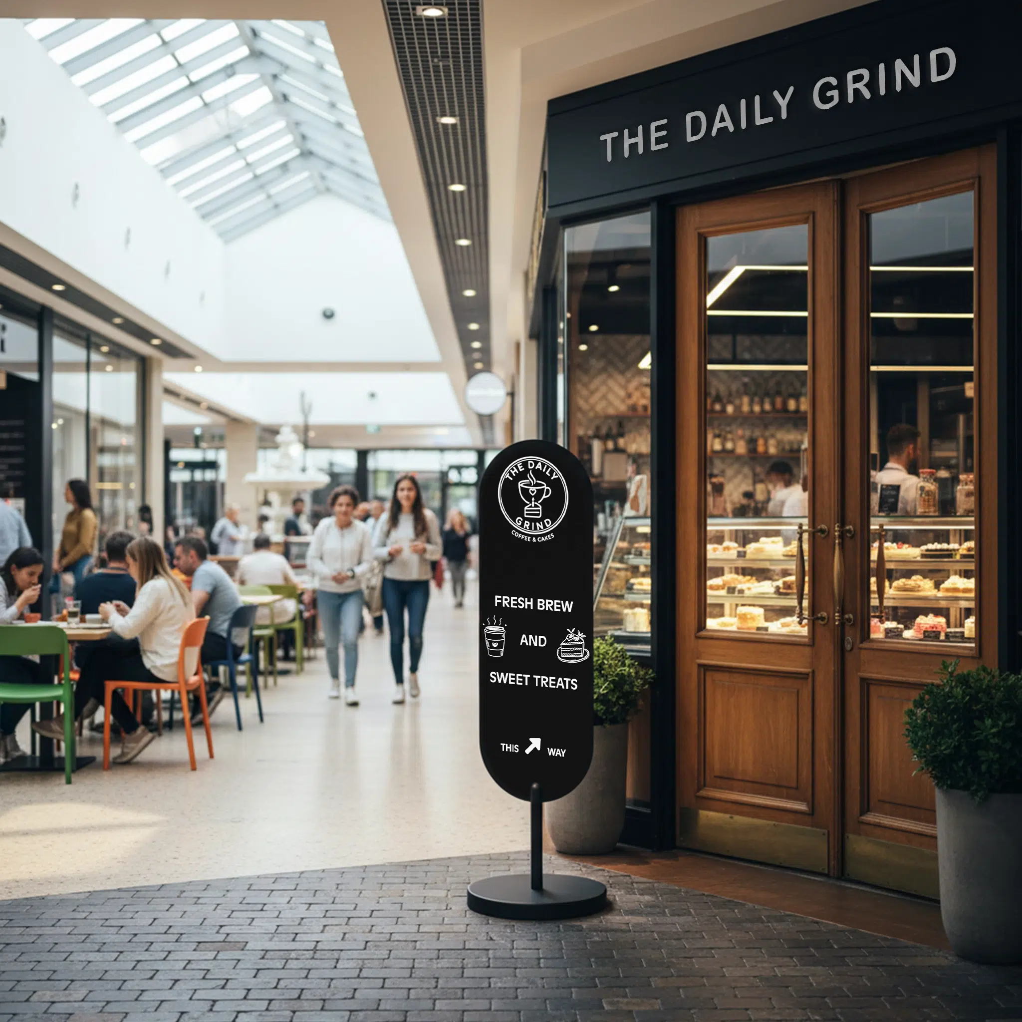 Cafés, bakeries, boutiques, hotel lobbies, shopping centres, market stalls, directional signage and pop-up events.