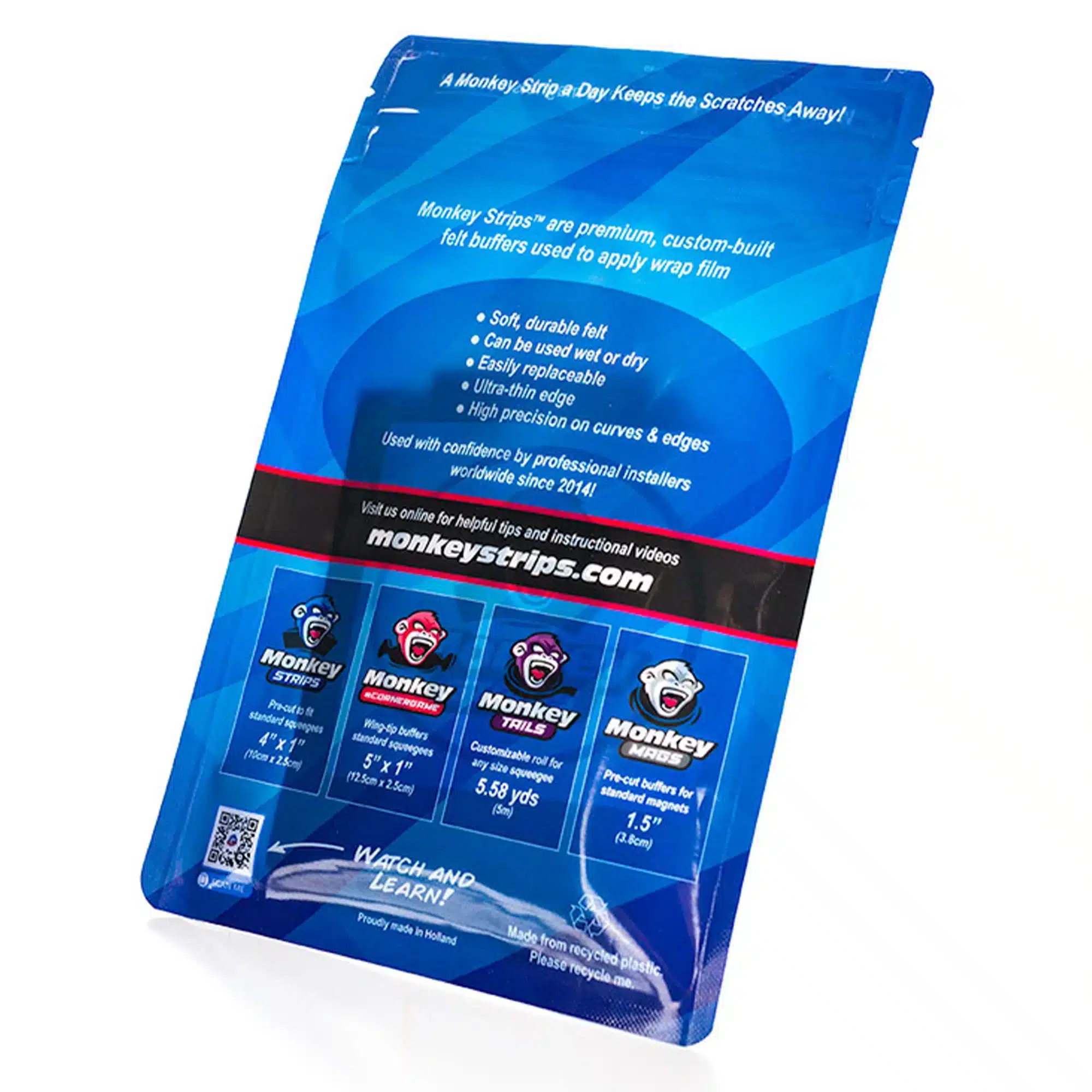 These long-lasting buffers have a low friction surface that allows the squeegee to glide across the film and almost eliminate common scratches. Monkey Strips are easy to remove and leave very little adhesive residue on the squeegee. Monkey Strips are distinguished by their thinness when compared to other squeegee buffers on the market.