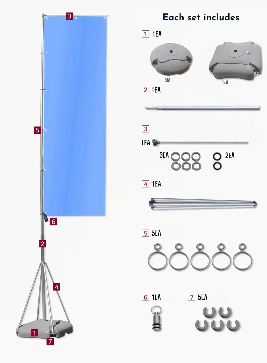 The water bases (square for the 5.4M-version and round for the 4M-version) are incredible to keep the centre of gravity low and your flag stable.