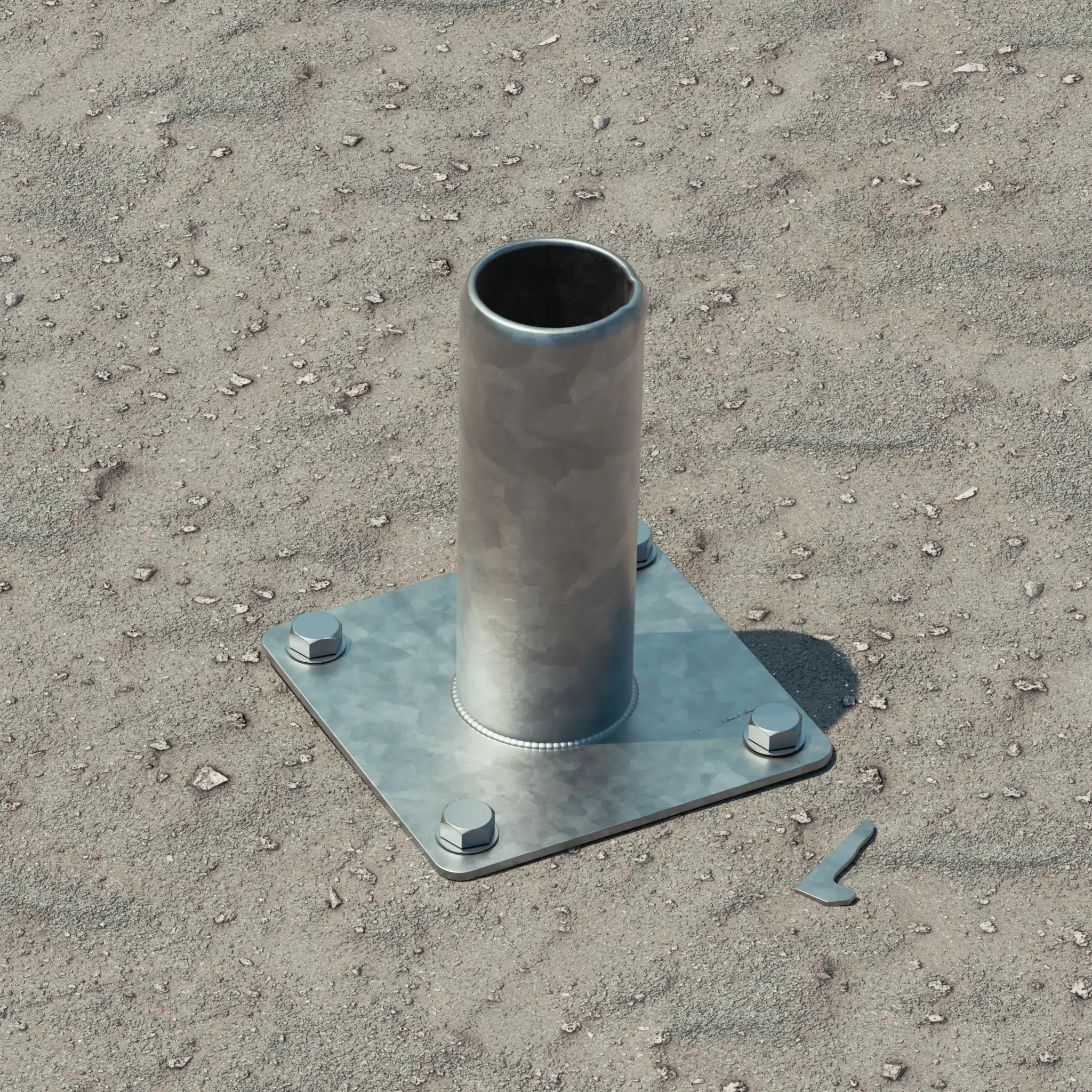 Featuring a 60 mm outside diameter, it accommodates standard sign posts and comes with a lock pin for added security. The surface-mount base (150 mm × 150 mm) includes four pre-drilled holes suitable for M10 bolts, allowing quick, stable installation on concrete, asphalt, or other solid bases.