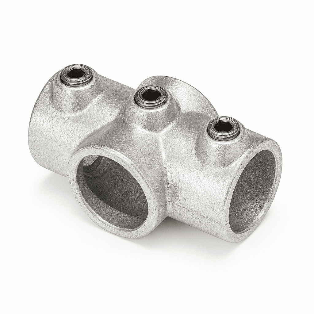 Keep long runs aligned and add mid-rails or bracing with the Tubemate 180° 4-Way Connector. It gives you a straight through-rail plus two side outlets in the key clamp fitting system, ideal for wide bays and multi-panel sign walls.