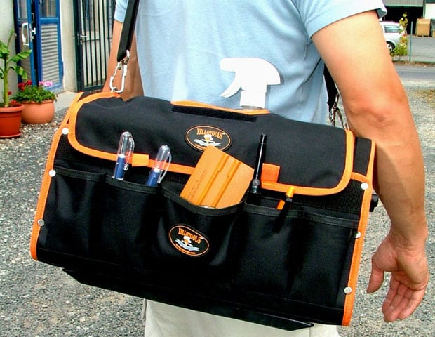 Our answer was the big SignToolBox, a tool bag with many practical features. Everything a signmaker needs finds its place in specially sewn compartments and pockets: squeegees, spray bottles, heat guns, cleaning supplies, knives, tweezers & weeders and much more!
