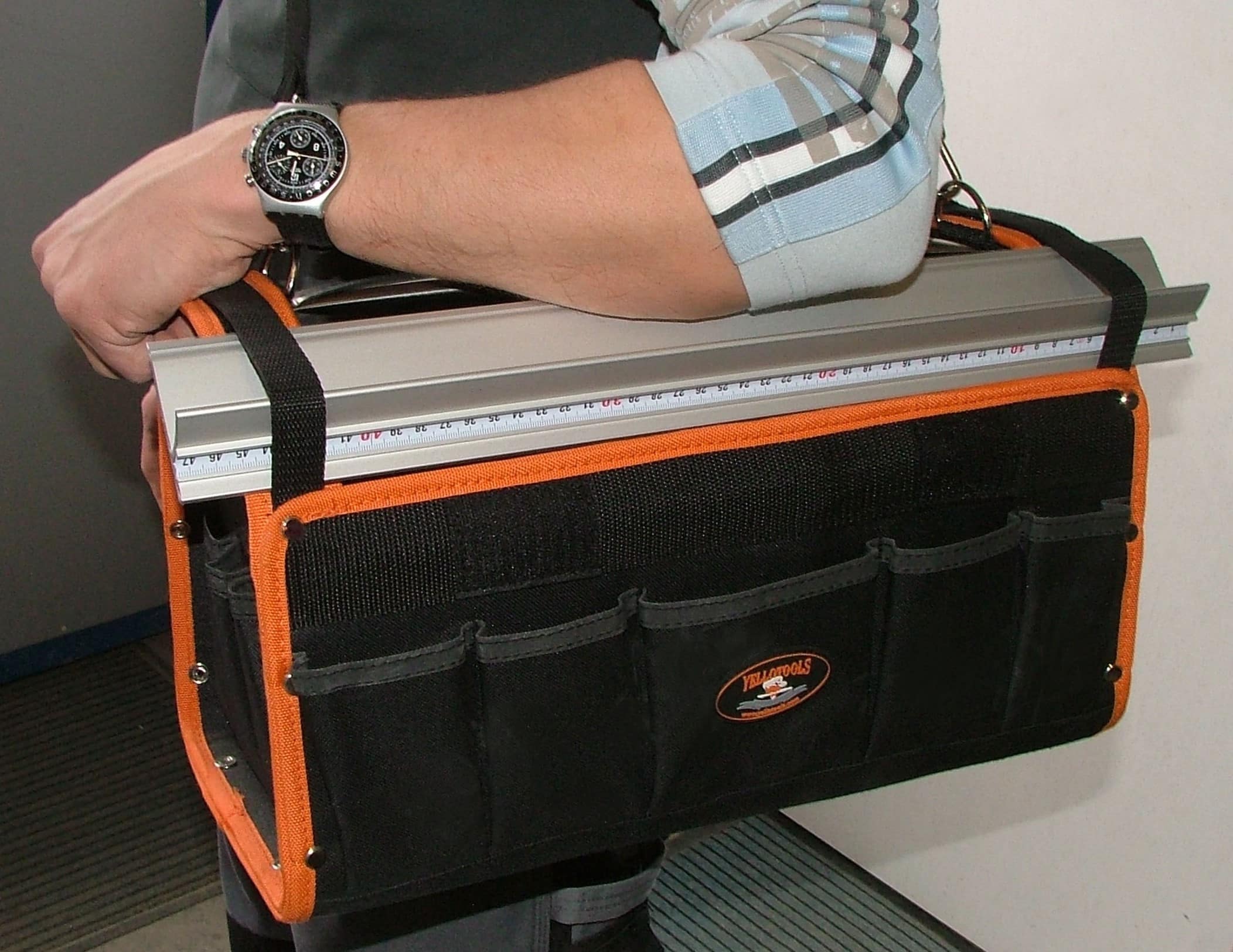 The current version of the SignToolBox also offers a metal plate for mounting magnets, a steel clip for our FlatSignScale tape measure, a removable cover with a grip slot as well as a sturdy strap that allows to carry the fully packed bag on the shoulder 😉